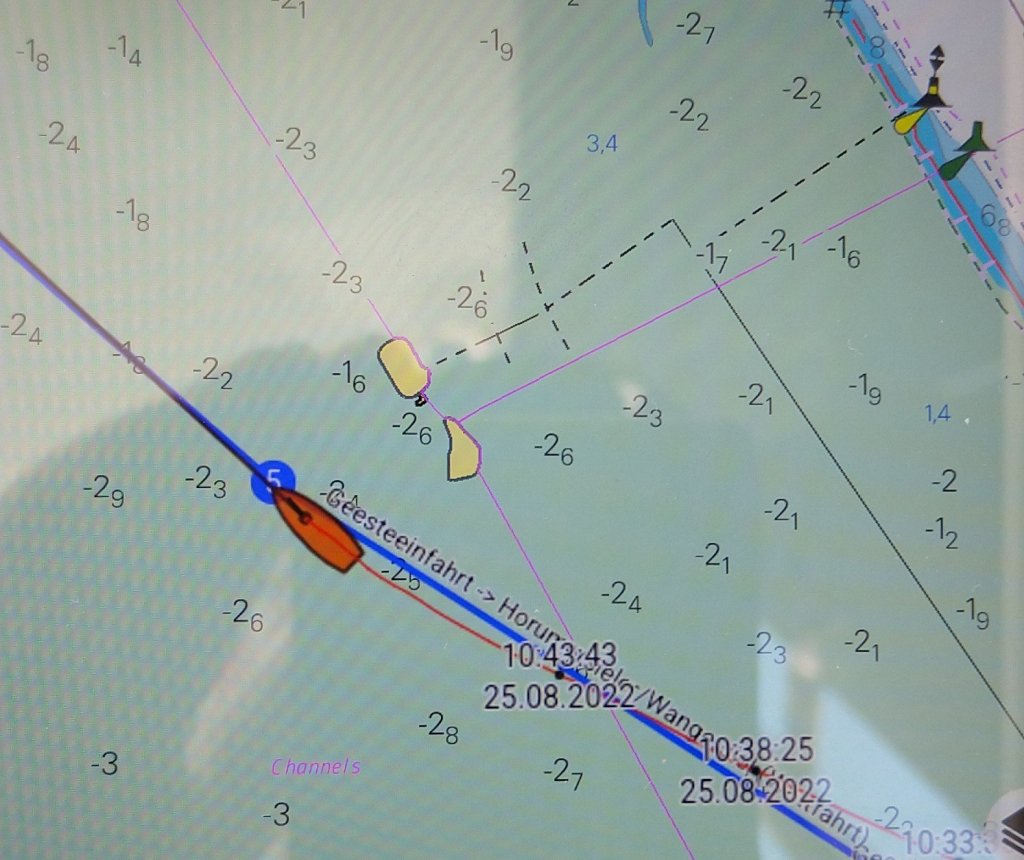 Als Besonderheit sollte eine von Wattenfuchs Werner F. empfohlene Direktverbindung mit erheblichem Zeitgewinn genutzt werden. Sie führt quasi ohne große Schlenker direkt dorthin, ist aber natürlich nur für sehr flachgehende Boote, wie die Fiedje, nutzbar.