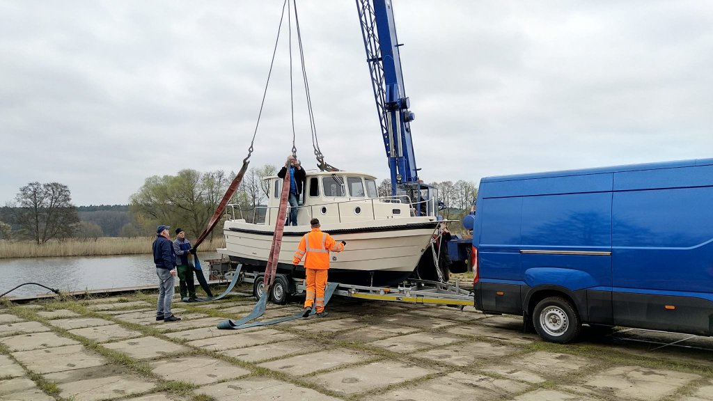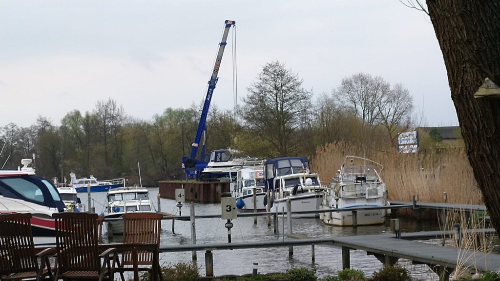 Bereits am 15. April erfolgte bei ziemlich miesem Wetter die Wasserung in der Marina Oderberg am Oder-Havel Kanal. Der Yachthändler meines Vertrauens brachte das Boot per Trailer und ich schloss mich dem allgemeinen Krantermin hier an.