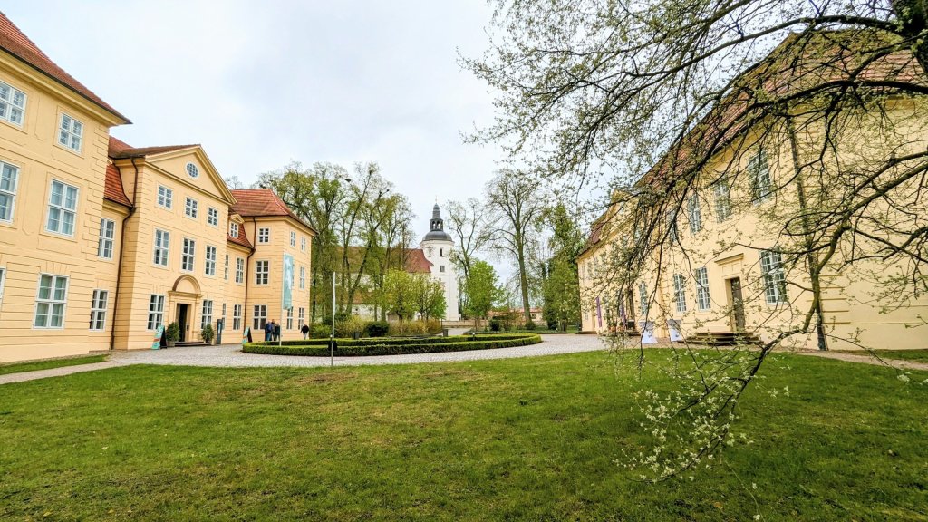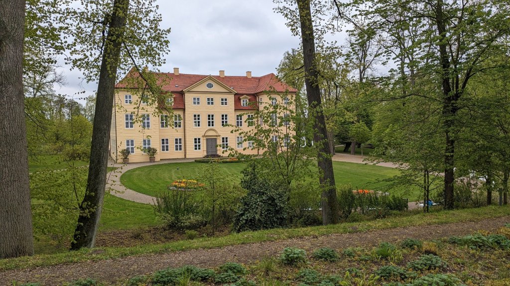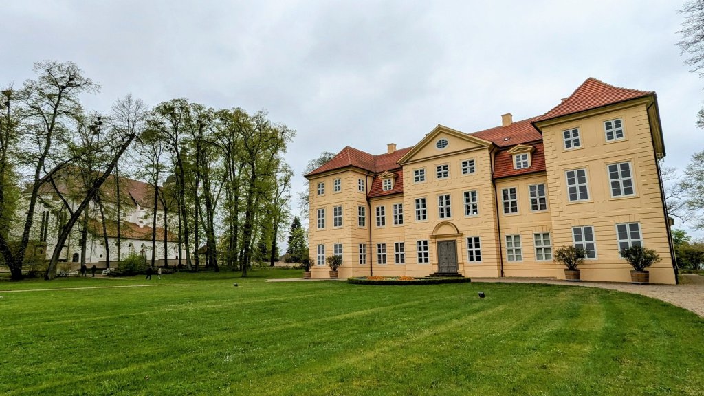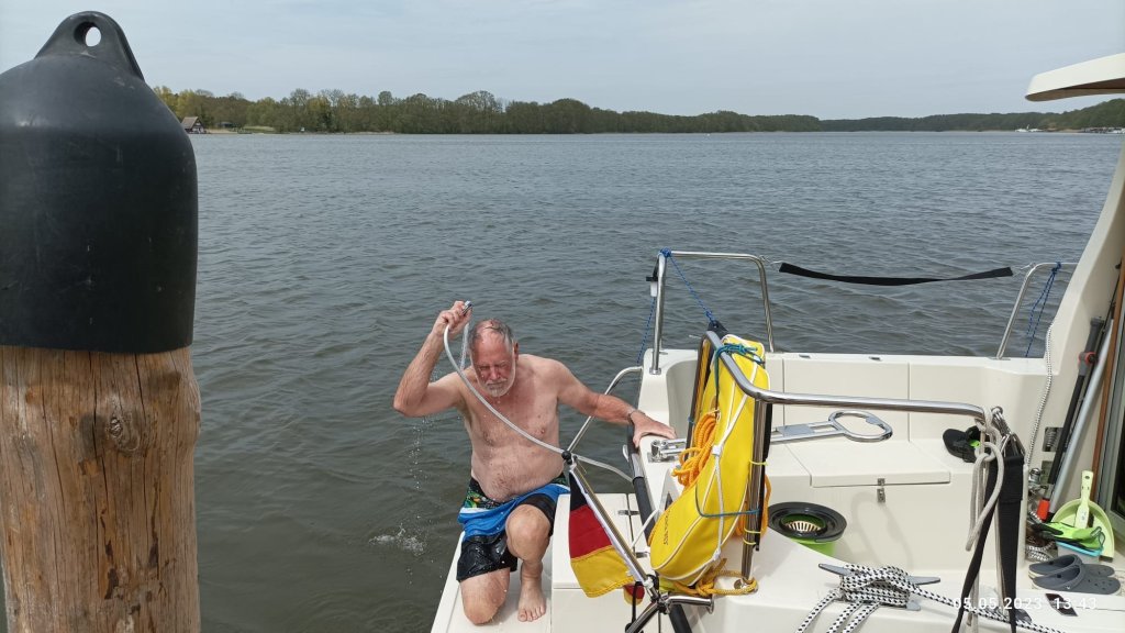Der Stadhafen in Mirow ist leider wegen der Baufälligkeit des langen Steges geschlossen. Zu Minerva passt auch besser die Marina an der Schlossinsel – eine Göttin gehört aufs Schloss. Das Schloss stammt im Kern von 1708 und lehnt sich an die französischen Landschlösser des 18. Jhdt an. Es war eine der Nebenresidenzen der Herzöge Mecklenburg-Strelitz, Jetzt vom Land Mecklenburg-Vorpommern umfassend restauriert beherbergt es ein Museum. Wir kümmern uns aber erst mal nicht ums Schloss, sondern nehmen das angekündigte Mittagsbad, weil die Sonne jetzt auch ein wenig durchkommt. Wasser 14,5 Grad – na das nennen wir doch eine Steigerung gegenüber gestern. Außerdem testen wir die Heckdusche (noch warmes Wasser vom Motor).