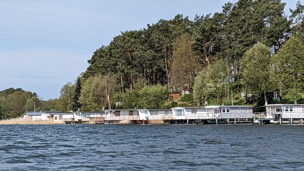 Folgende Seen haben wir nach dem Start im Ziernsee durchfahren: Ellenbogensee, Gr. und kl. Pälitzsee, Canower See, Labussee, Peetschsee, Vilzsee, Mössensee, Zotzensee und schießlich unser Tagesziel nach 27 km der Mirower See. Die Schleusen Canow und Diemitz werden auch durch Schleusenwärter bedient. Wir sind begeistert von den sehr vielen Bootshäusern, die wir passieren.