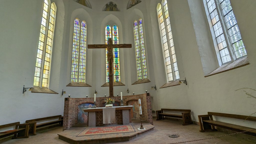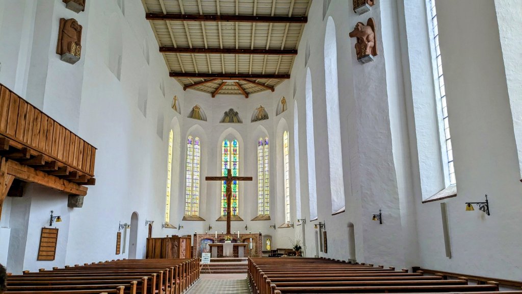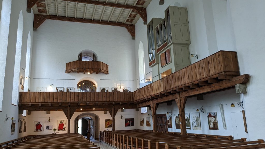 Es hat die ganze Nacht geregnet, morgens dann Sprühregen, der den ganzen Tag anhielt  Es war eine sehr gute Idee, die Kirche auf der Schlossinsel zu besichtigen. Eine freundliche Dame ließ uns schon vor der offiziellen Öffnung herein.