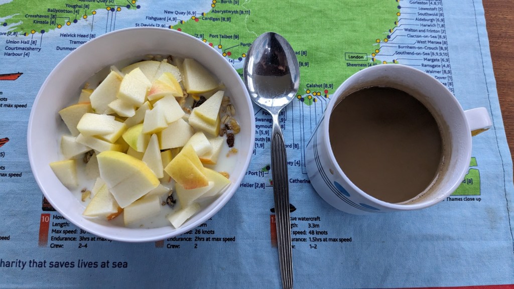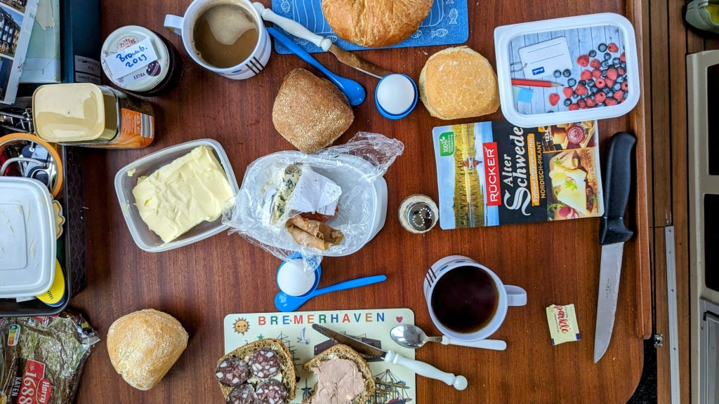 Freitag fing richtig gruselig an. Ein mächtiger Regenschauer. Zeit dann für ein ausgedehntes Frühstück in der gemütlich Kabine von Minerva.