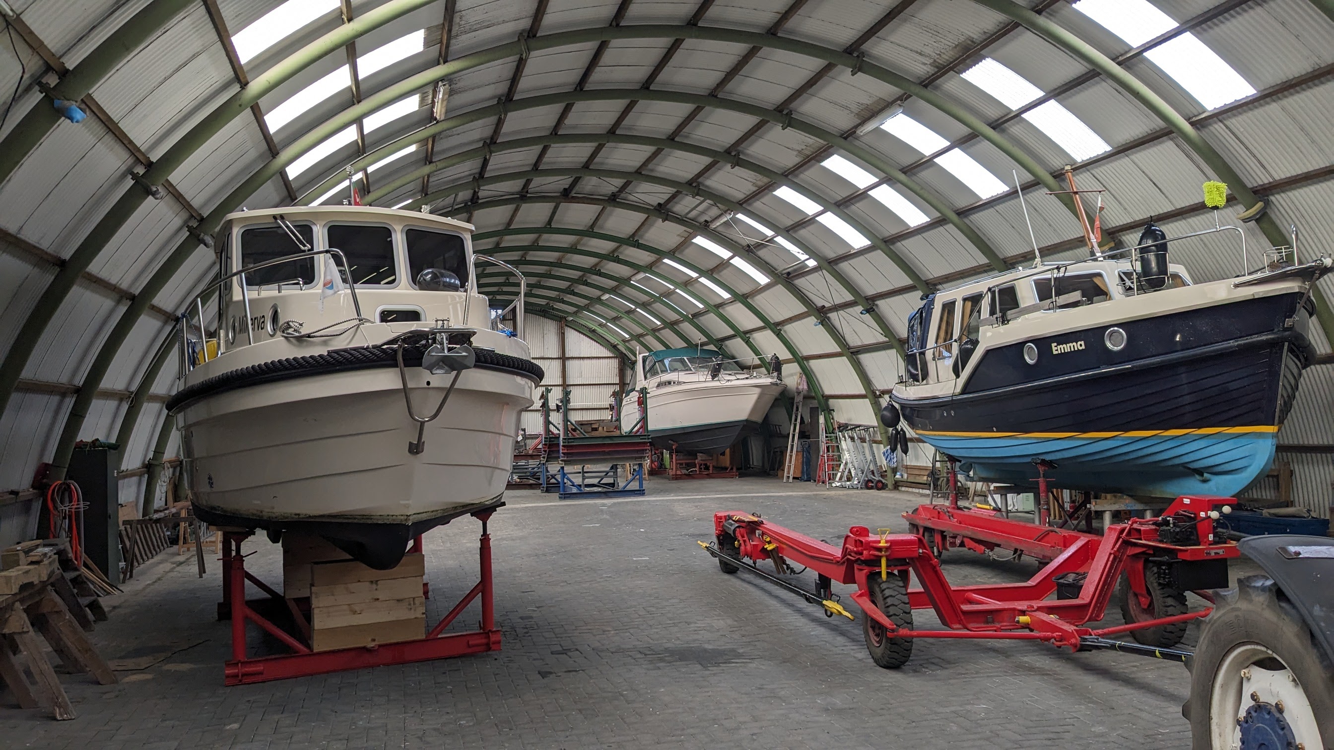 Das Boot liegt jetzt bereits in der Halle, weil ich mit Hilfe von Vereinskameraden nochmals das Ruder ausbaute. Ein Schmiernippel soll in den Ruderkoker eingebaut werden.