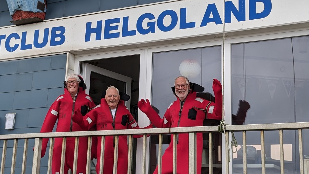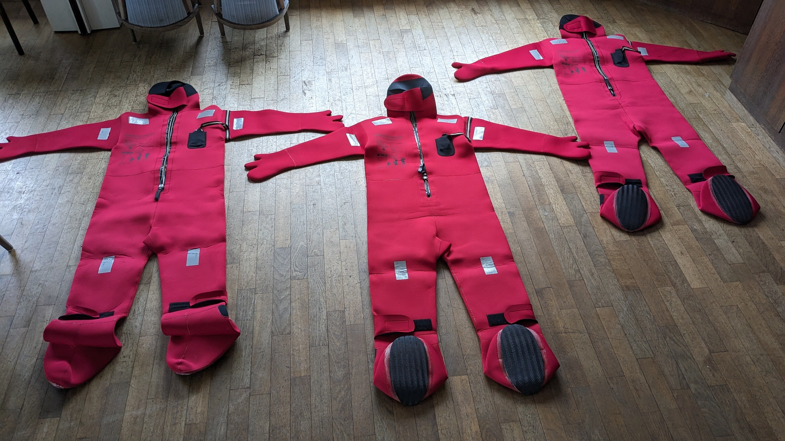 Morgens machten wir uns noch den Jux und zogen Überlebensanzüge an, die ein Segler uns für die Segeljugend zum „Ausprobieren“ überlassen hatte.
