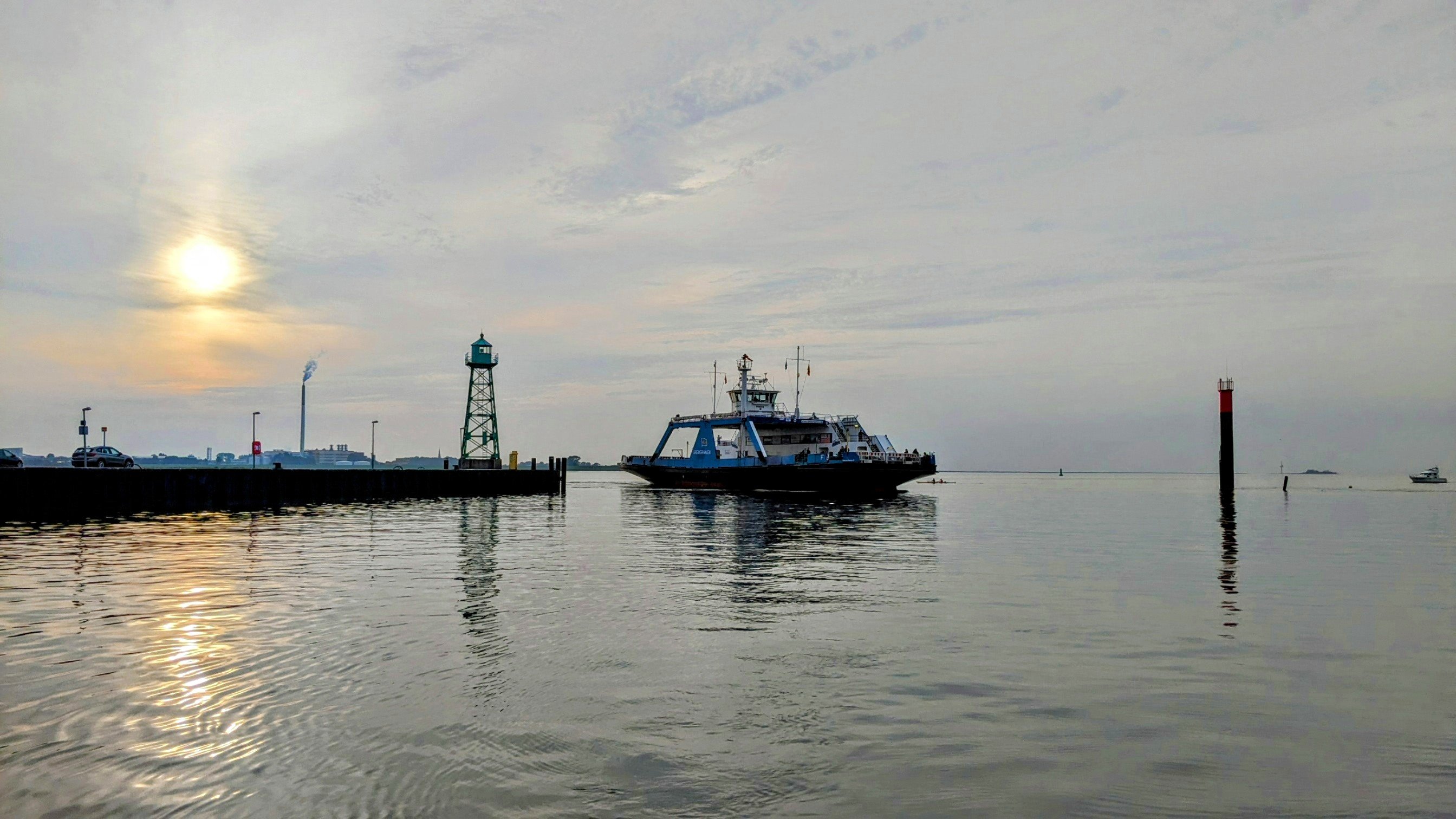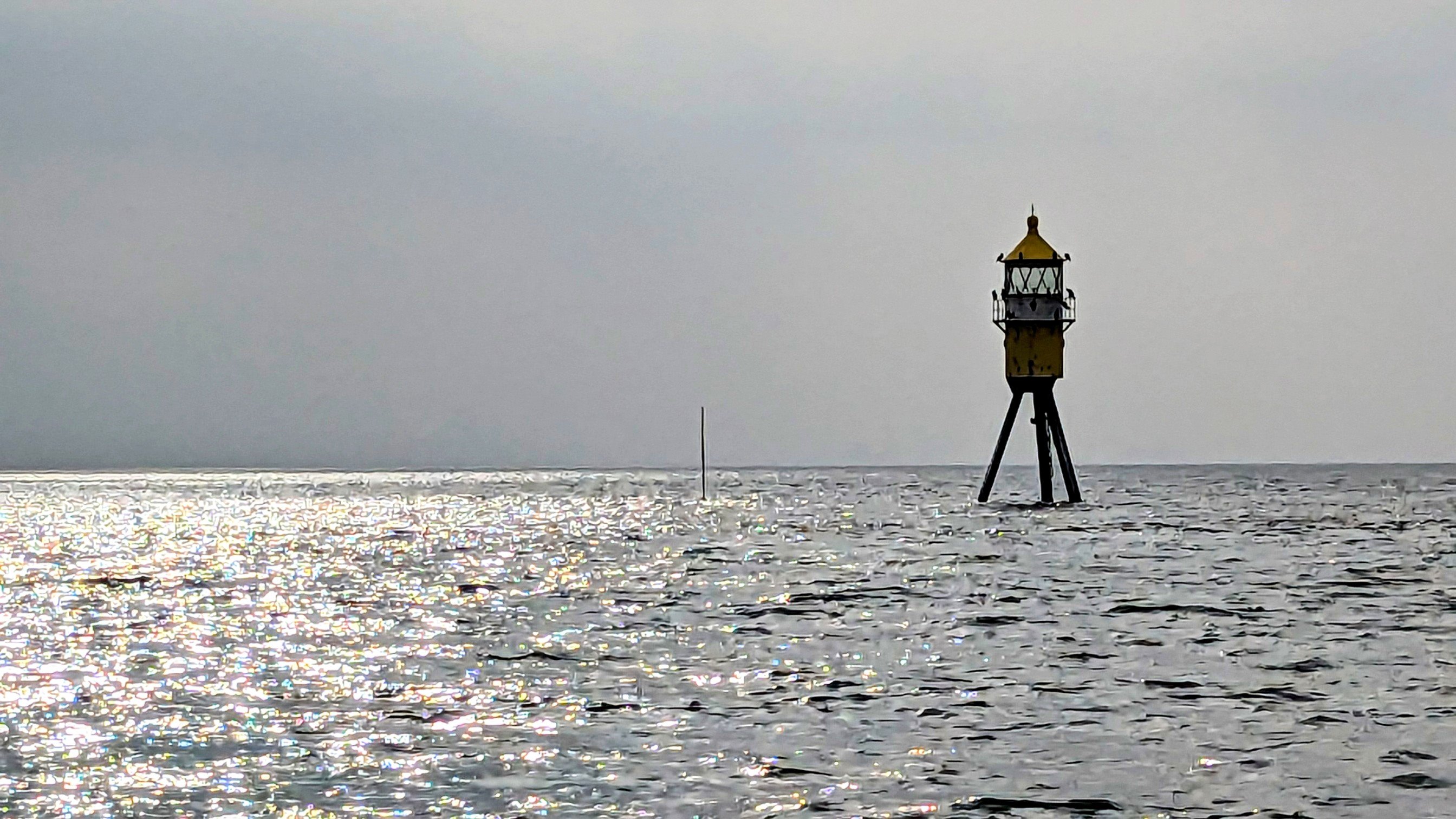 Hinter den Türmen wurde es in der Wesermündung friedlich. Wir brauchten wegen geringer Fahrt im Wellengang allerdings länger als üblich und genossen später im Geeste-Vorhafen die bereits untergehende Sonne.