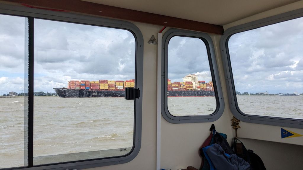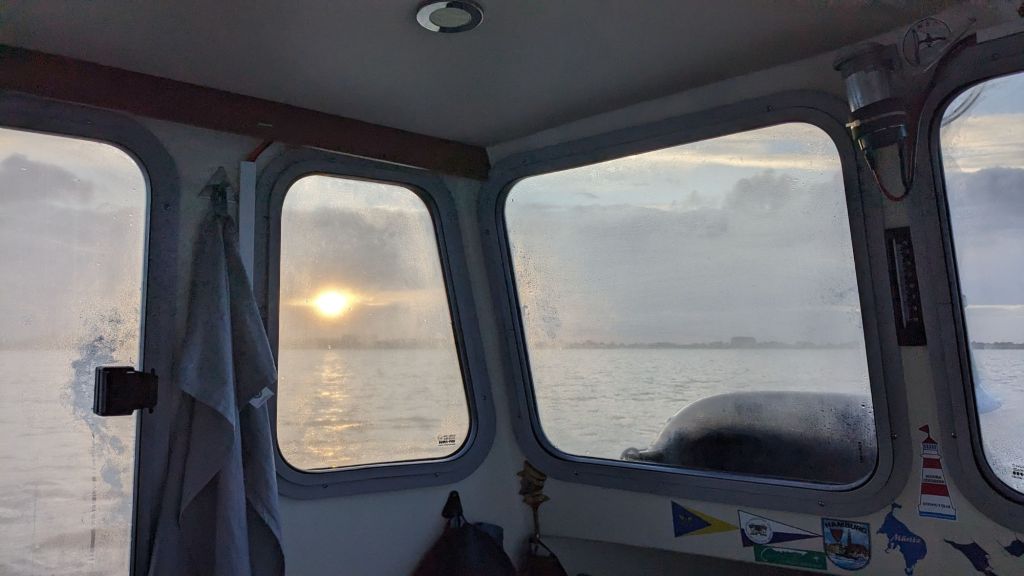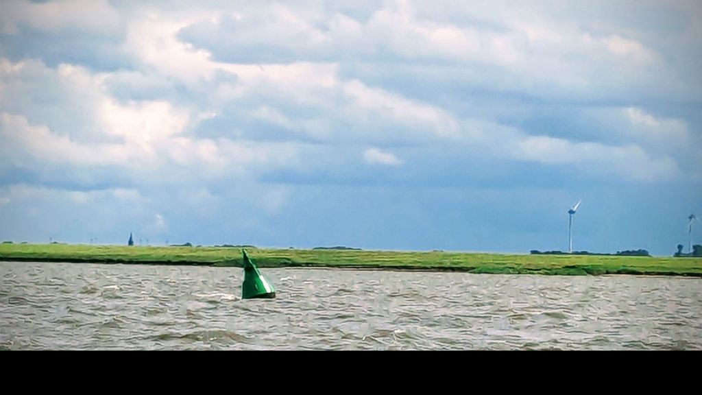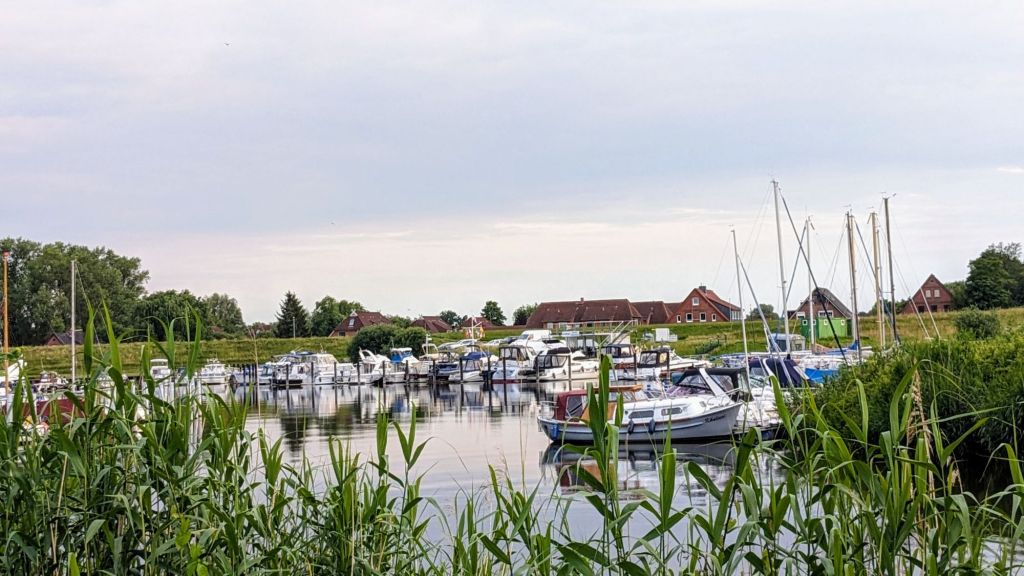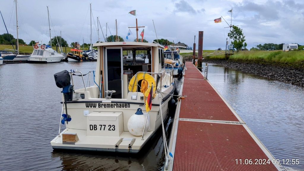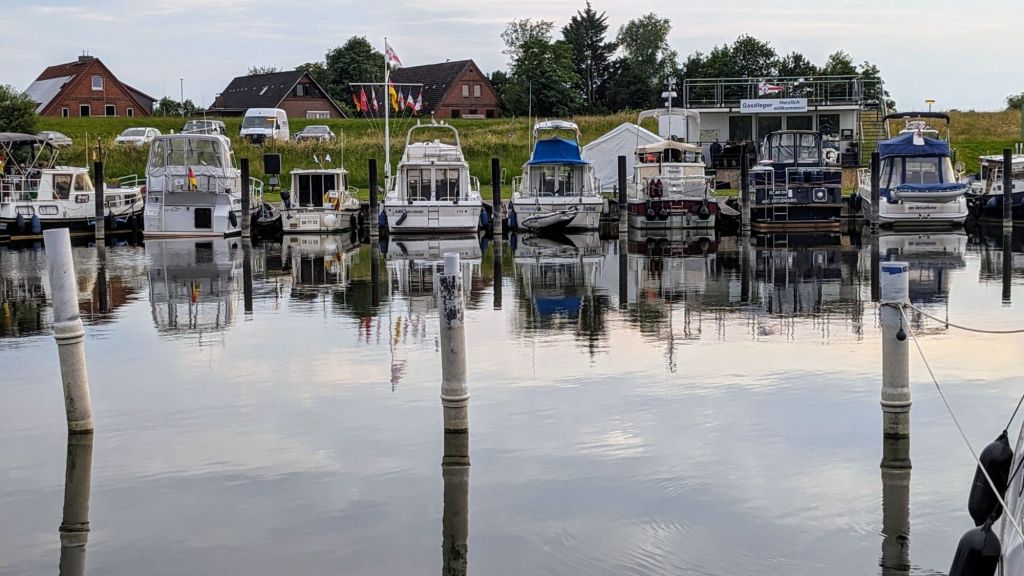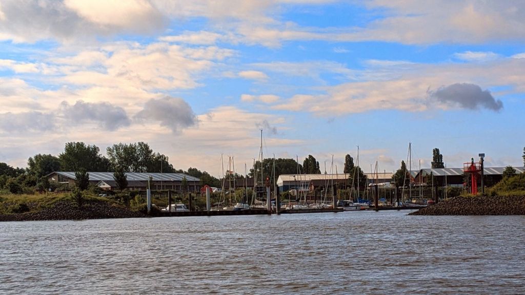 Am Folgetag nutzte ich die erste Schleuse zusammen mit den Seglern um 08:30, um im Yachthafen erneut fest zu machen. Tidebedingt würde eine Weiterfahrt nicht vor 14:00 möglich sein (2 h nach NW Otterndorf). Der Wetterbericht verhieß allerdings nichts Gutes. Mehrmals zelebrierte DP07 den Wetterbericht und genoss sichtlich die Böen- (Bft 8) und Gewitterwarnungen. Ich genoss die Stunden an Bord und beobachtete das wechselhaften Schauerwetter.