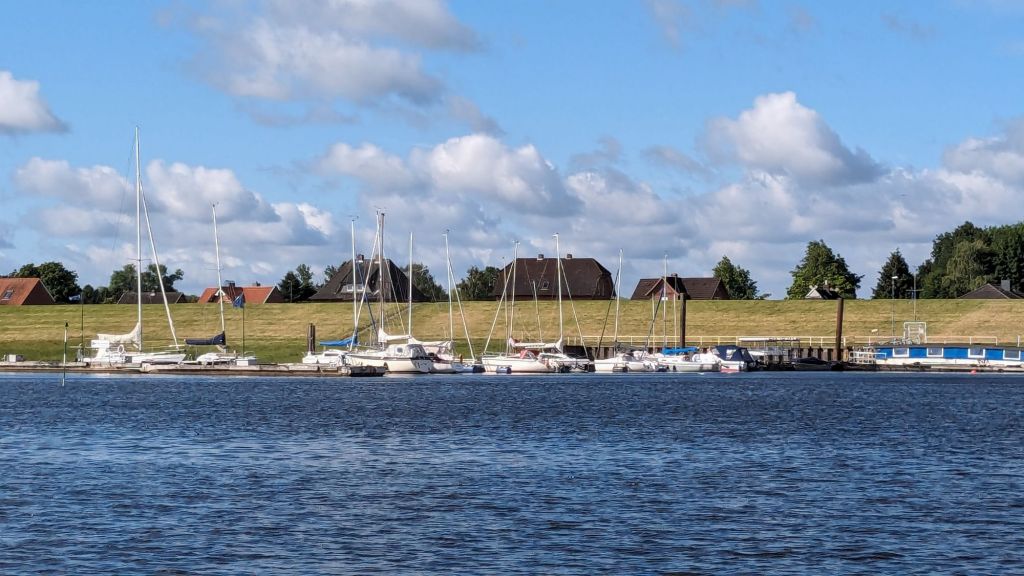 Um 14:00 lief ich aus: Bft 5 von achter und ekelige Kabbelsee auf der Elbe. Gegenan wäre mit meinem Boot unmöglich gewesen. So aber rauschte ich mit max 9 kn an Brunsbüttel vorbei und hatte am Steuerrad ordentlich zu kurbeln. Schon nach 3,5 h erreichte ich den Ruthenstrom und machte an der schönen Anlage des WSDE mit seinen 2 x 500m langen Schwimmstegen vor dem Sperrwerk fest. Hier lag ich schon mal eine ganze Saison mit meiner SY Swantje.