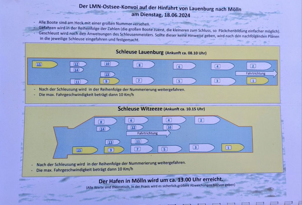Heute am 18. Juni ging’s bereits um 08:00 direkt in die Schleuse Lauenburg. Benno – unser Vorturner vom LMN – hatte alles bestens vorbereitet und allen Booten Schleusenplätze zugeordnet. Und wie durch ein Wunder klappte alles bestens.