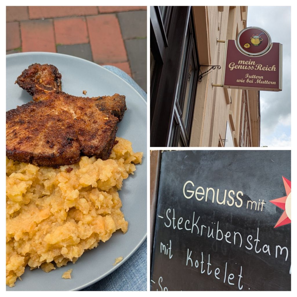 Nach der Führung zerstreuten wir uns. Ich besorgte noch eine Flasche „Nachttisch“ für den morgigen Grillabend und aß in “ mein Genußreich“ vorzüglich Steckrübenstampf mit Kotelett. In einem Café traf ich auf Lutz mit Familie und kam am schwedischen Eisbecher ( der mit Apfelmus,Sahne und Eierlikör) nicht vorüber.