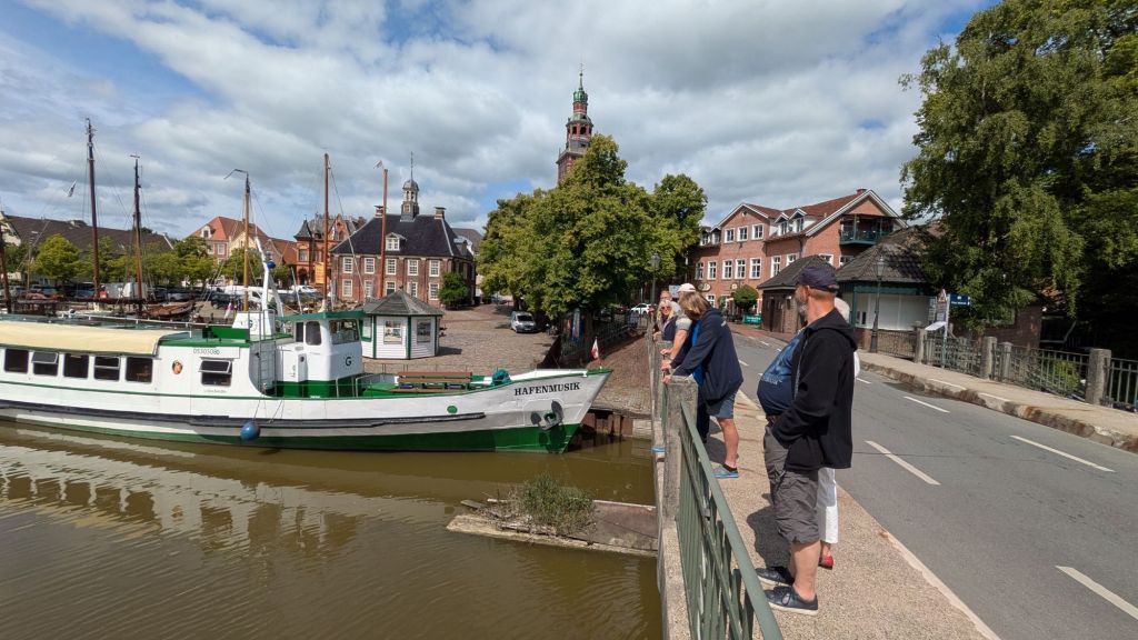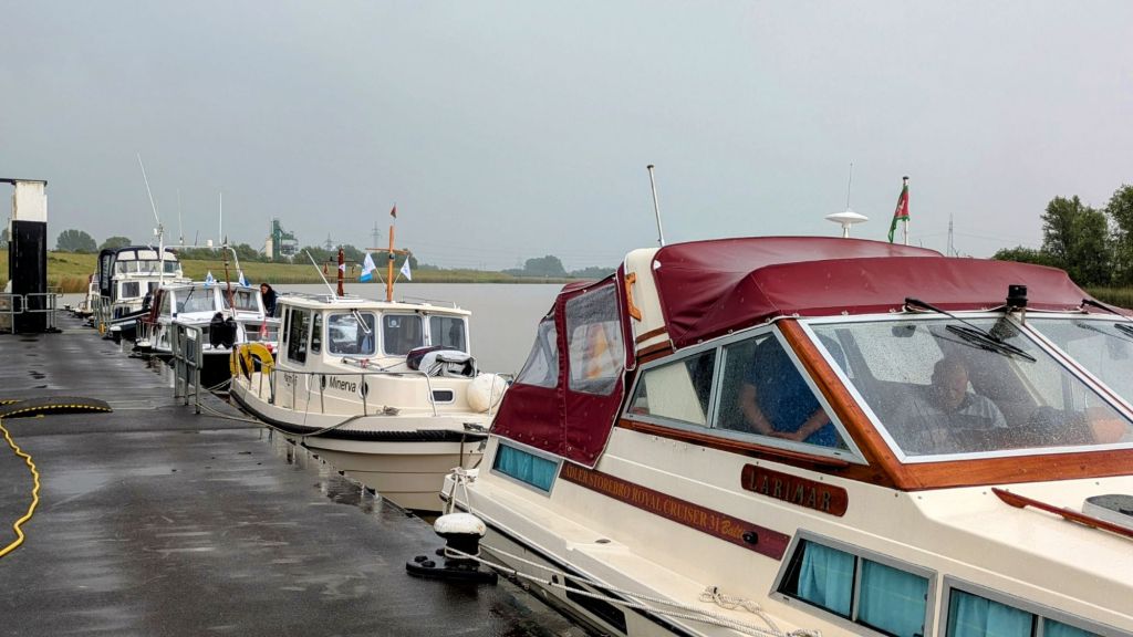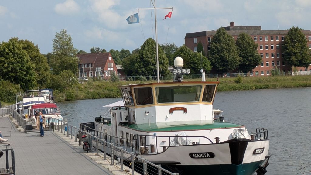 Wir waren um 12:30 zu früh in der Leda. Das Schleusenpersonal ließ sich aber nicht überreden und bestand auf der Schleusenzeit 14:00. Wartezeit an einem Ponton.