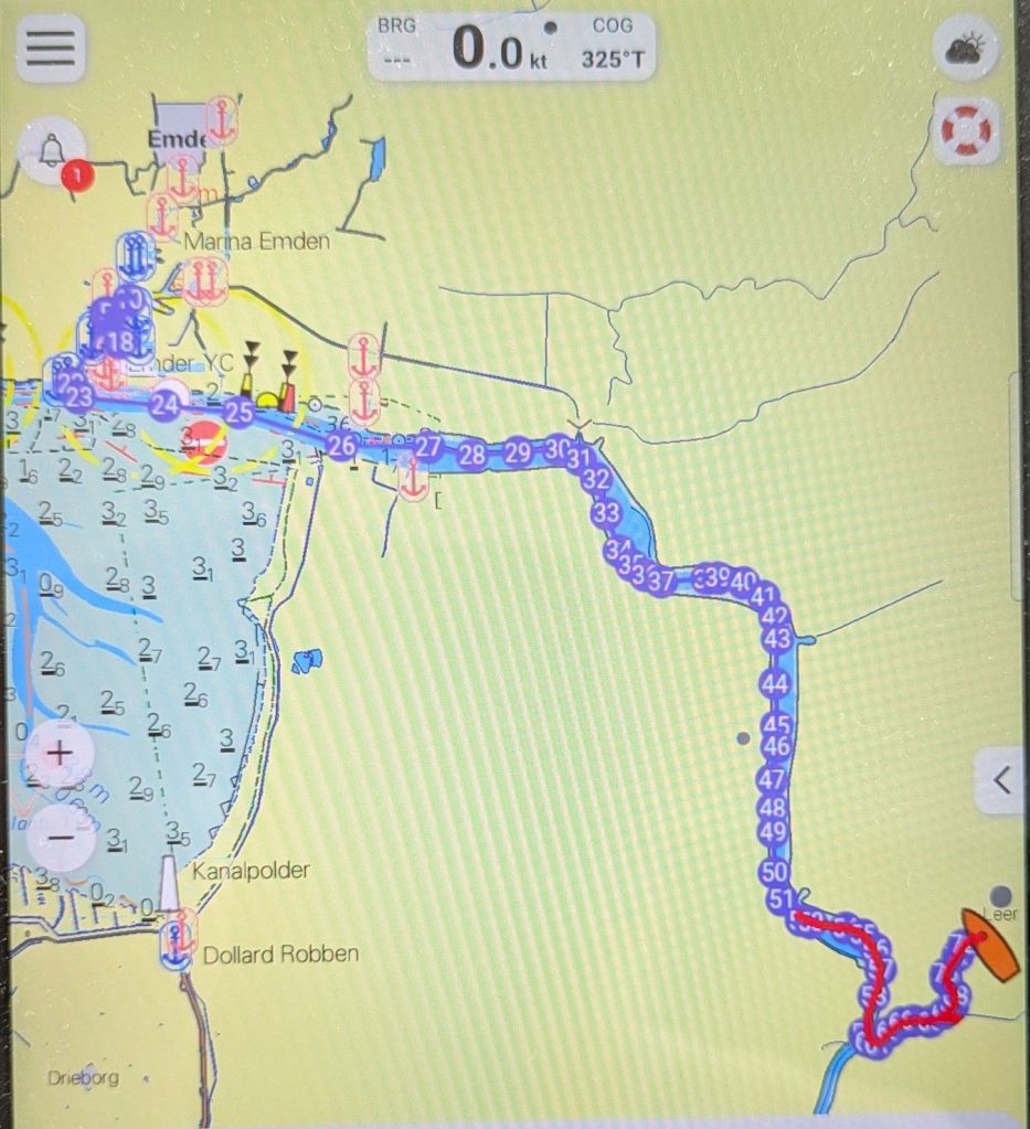 Um 08:30 lösten wir in Emden die Leinen. Kurze Wartezeit vor der Eisenbahnbrücke und dann direkt in die Große Seeschleuse, die auf unsere Anforderung hin schon geöffnet hatte. Kurz nach 10:00 waren wir bereits in der Ems. Wir hatten Bilderbuchwetter und glattes Wasser. Traumhaft !