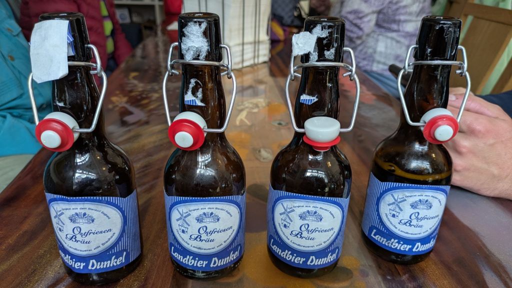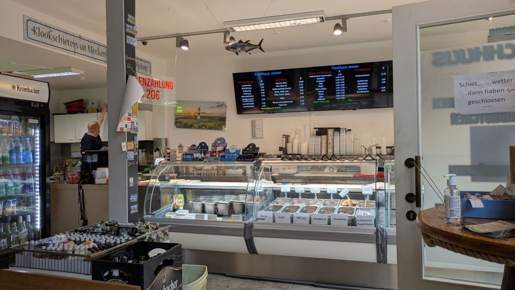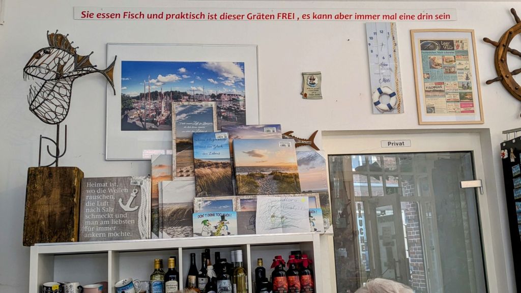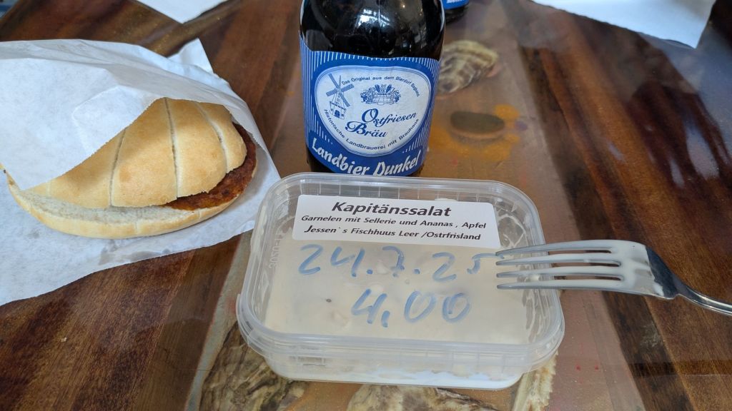Das war der bei weitem schlechteste Tag dieser Reise. Ständiger Regen mit nur kurzen Unterbrechungen. David und ich nutzten trotzdem den Vormittag und schlenderten durch die Stadt: Möbelhaus mit tollen Holzmöbeln, Antikladen ûber 2 Stockwerke mit allerlei Kommissionswahre und zum Schluss Jessens Fischhuus mit lecker Fischbrötchen und Landbier.