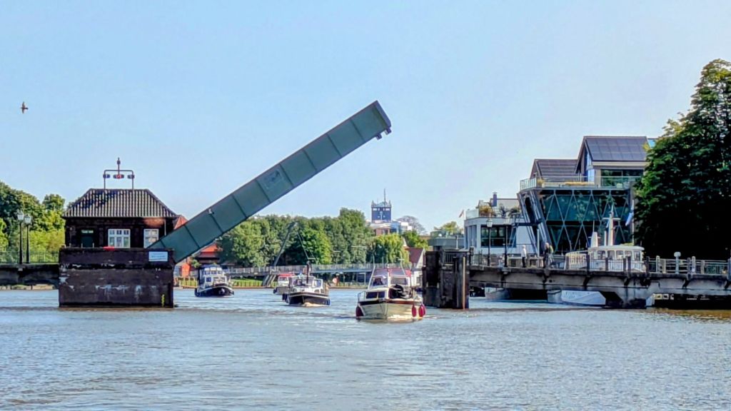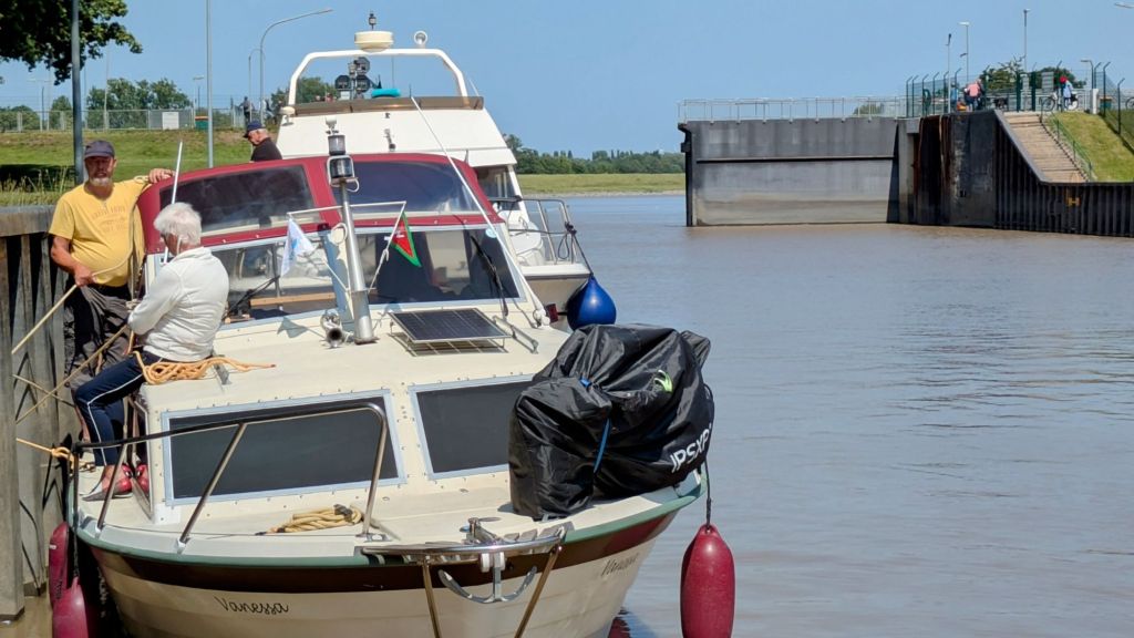 Mit der Hafenmeisterin in Leer war abgesprochen: 07:30 Brücke um dann 08:00 die Schleuse zu nehmen. Pustekuchen ! Bei Ankunft an der Brücke war man verwundert; Schleuse wäre wegen NW nicht vor 10:00 möglich. Also alle wieder zurück an ihren Liegeplatz.