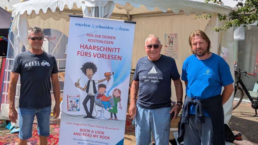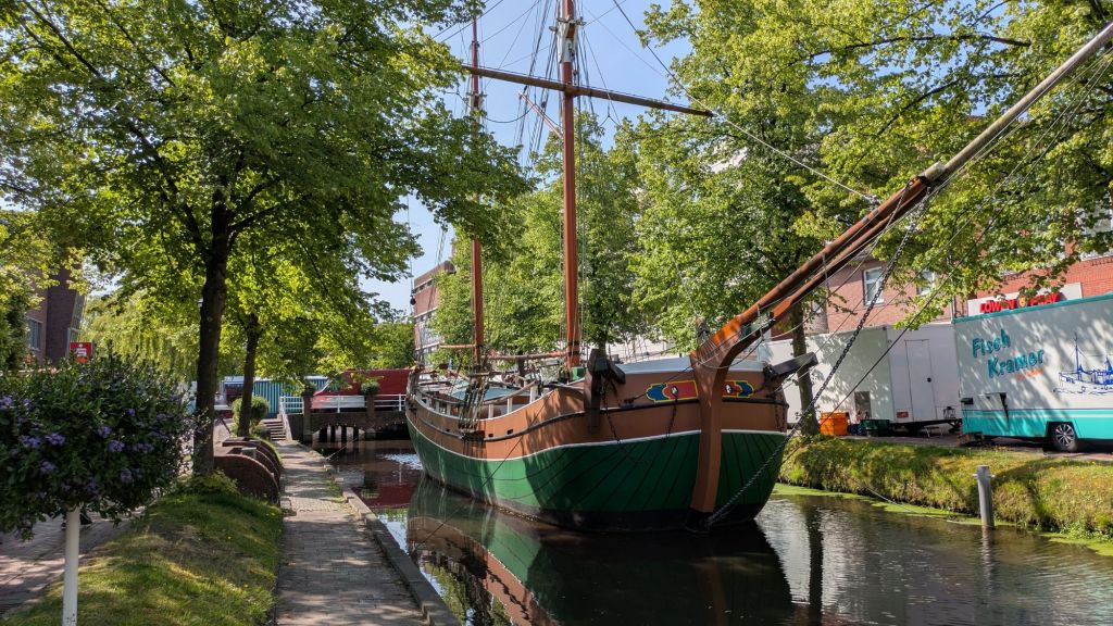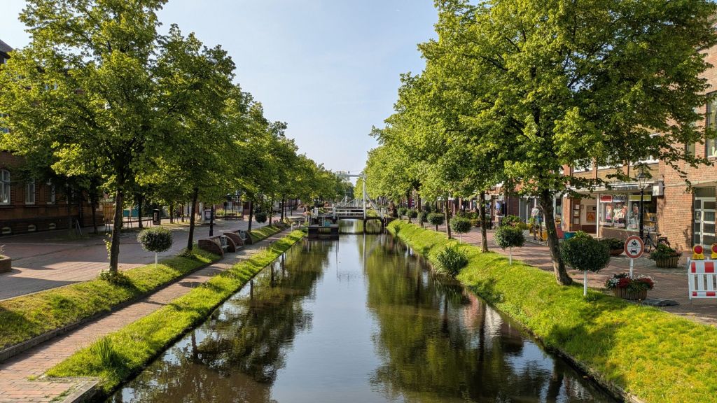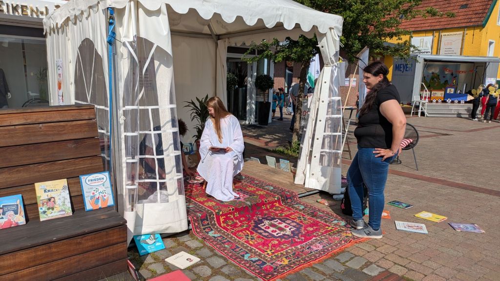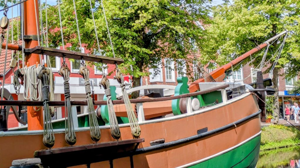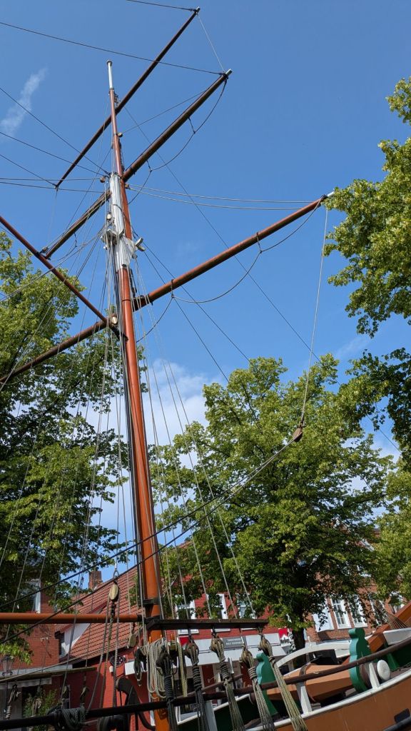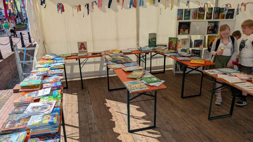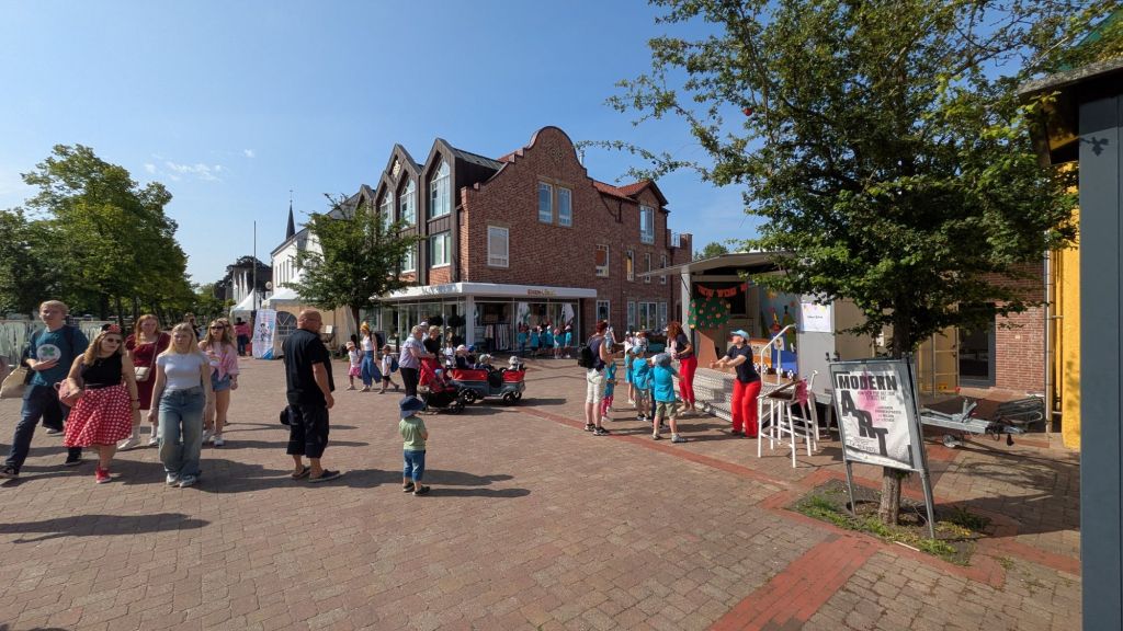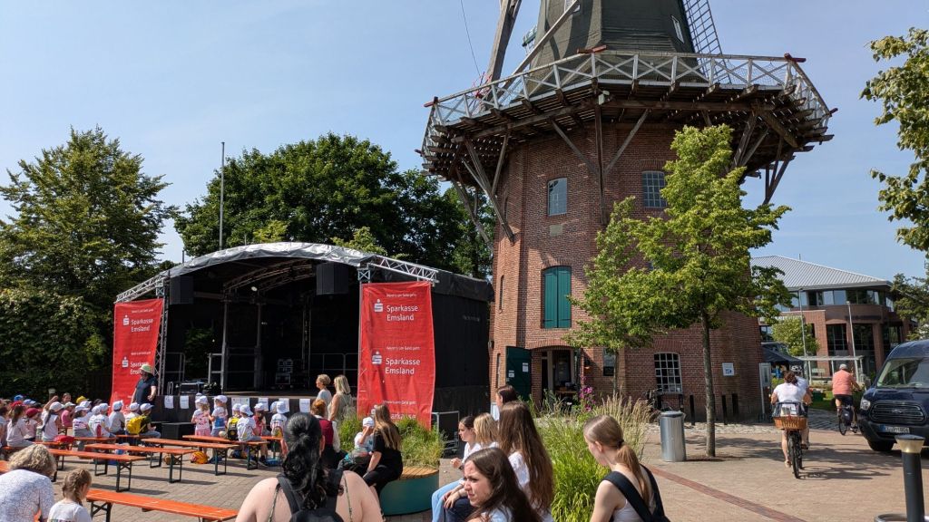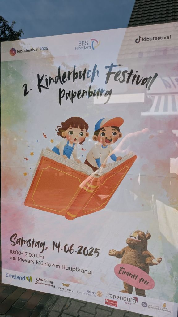 Freitagmorgen zog ich natürlich sofort los, um Papenburg zu erkunden. Ich war sehr positiv überrascht. Beiderseits des Hauptkanals ziehen sich zahlreiche Cafe’s und Geschäfte aller Art hin. Und es ist schön begrünt. Hier kann man es wahrlich aushalten ist später die einhellige Meinung. Und zufällig war hier das 2. Kinderbuchfestival Papenburg mit ganz vielen Ständen und Mitmachaktionen. Wie schön den Kindergarten-Gruppen bei ihren Aktivitäten zuzuschauen.