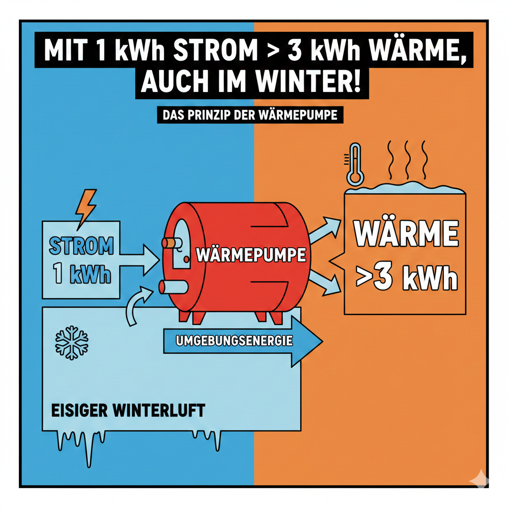 Genial: mit relativ wenig eingesetzter Energie, wird der Umgebungsluft Wärme entzogen und diese fürs Heizen nutzbar gemacht.