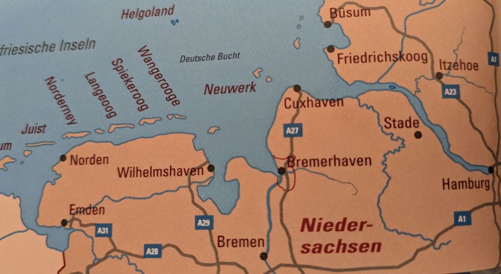 - Mitte Mai einen Rund-Törn von Wilhelmshaven durch den Ems-Jade-Kanal nach Greetsiel und von dort binnen der Ostfriesischen Inseln zurück nach Bremerhaven